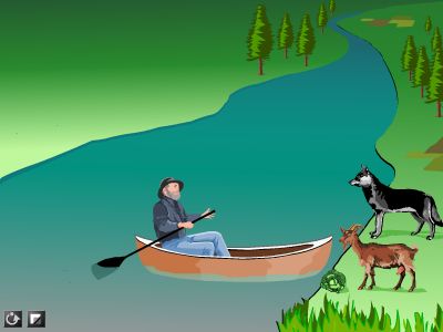 Problématique : un berger a un loup, une chèvre et un chou. En présence du berger, la chèvre ne mange pas le chou et le loup ne mange pas la chèvre. Pour traverser une rivière, le berger ne peut transporter qu'un de ses compagnons à la fois.