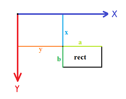 Fonction dessiner un rectangle "rect" qui prend 4 paramètres, à savoir son abscisse "x", son ordonnée "y" (donc les coordonnées, en pixels), sa taille horizontale "a" et sa taille verticale "b" (donc les dimensions, en pixels). "x" et "y" correspondent à l'angle gauche du rectangle, et "a" et "b" modifient donc sa taille respectivement vers la droite et vers le bas (voir image ci-jointe). Remarque : pour construire un carré, il suffit d'appliquer un "a" et un "b" égaux.