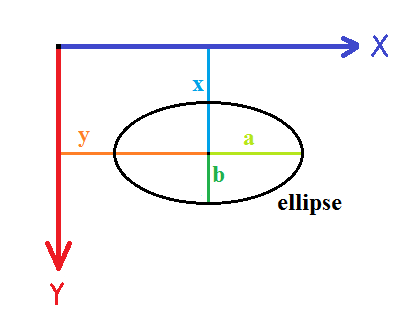Fonction dessiner une "ellipse" qui prend 4 paramètres, à savoir son abscisse "x", son ordonnée "y" (donc les coordonnées, en pixels), son rayon horizontal "a" et son rayon vertical "b" (donc les dimensions, en pixels). "x" et "y" correspondent au centre de l'ellipse, et "a" et "b" modifient son rayon respectivement horizontal et vertical (voir l'image ci-contre). Remarque : pour construire un cercle, il suffit d'appliquer un "a" et un "b" égaux.